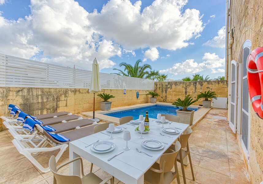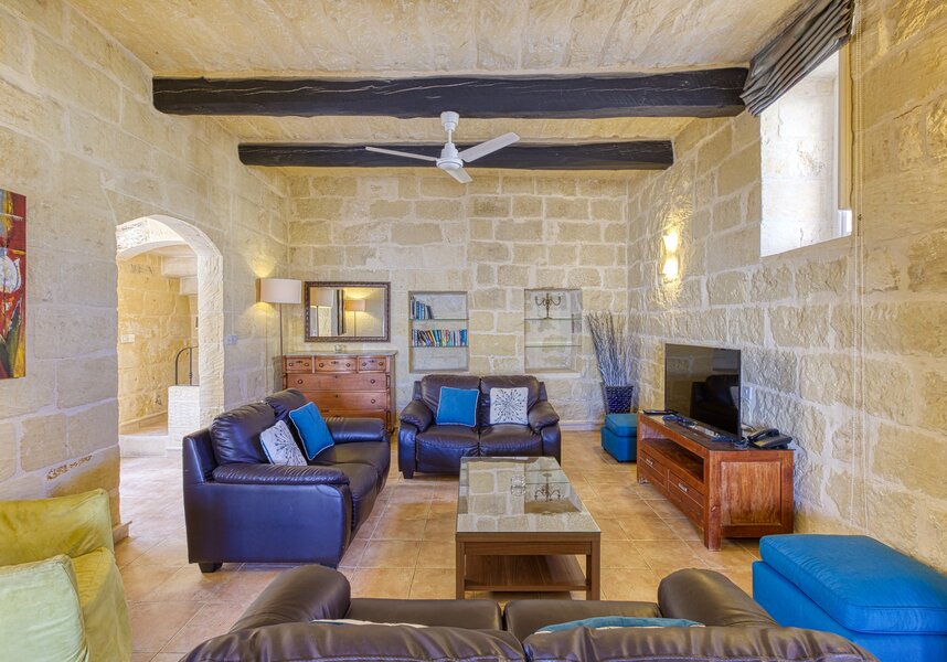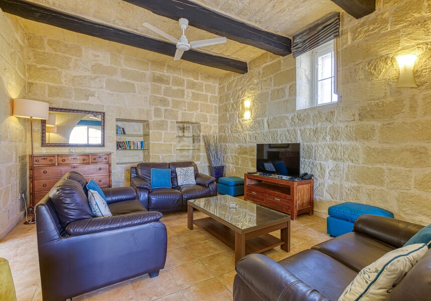 The lounge area makes a homely relaxing Gozo retreat for couples and families with a flat screen TV and Wi-Fi for cooler days or escaping the sun.