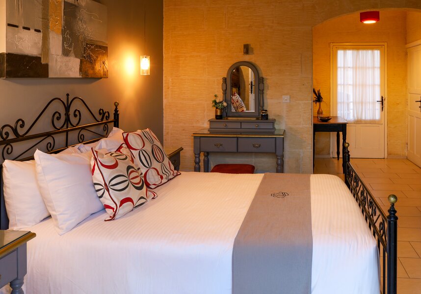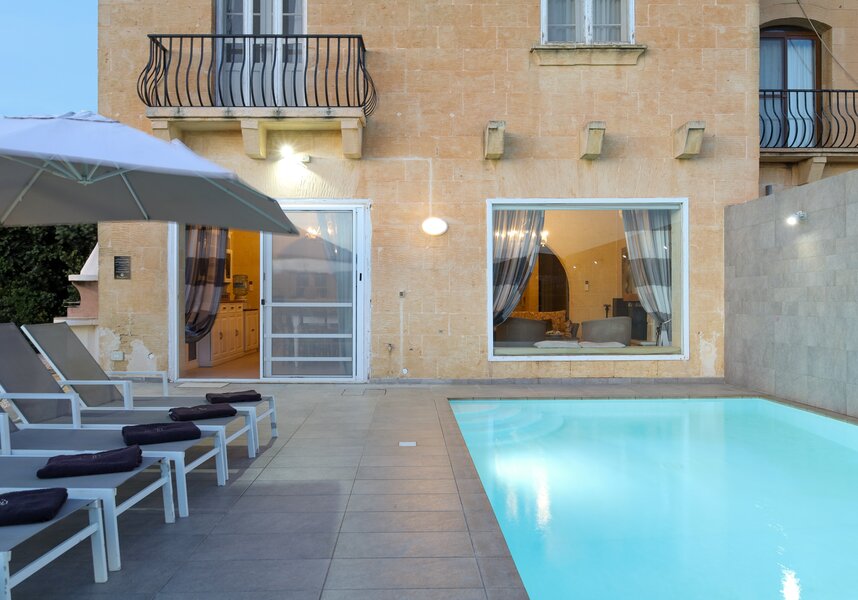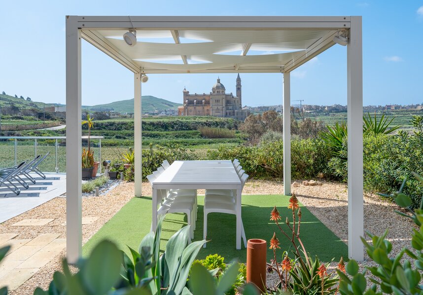 The infinity pool and pretty garden terrace have uninterrupted “front of house” views. Adjacent to the pool terrace is a large feature dining table with canvas top. In direct line of sight to the church, it makes a classie excuse for “dining out”. The peace and tranquillity of Twilight equal those of Ta Pinu.