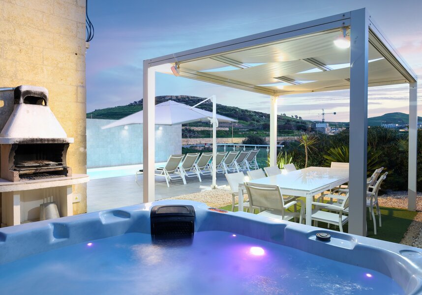 An inbuilt stone BBQ is also next to the jacuzzi and dining area.