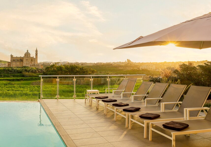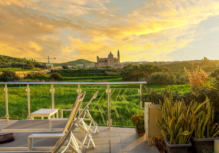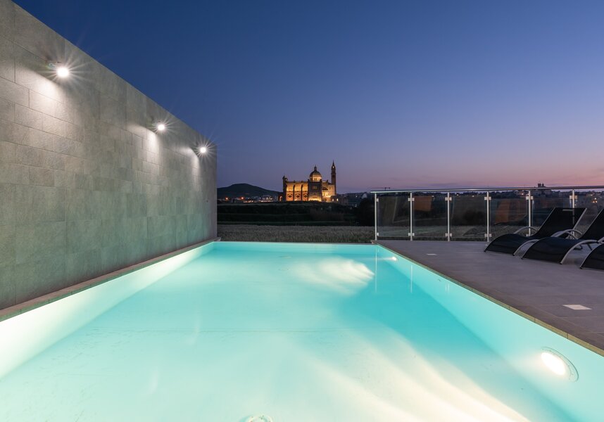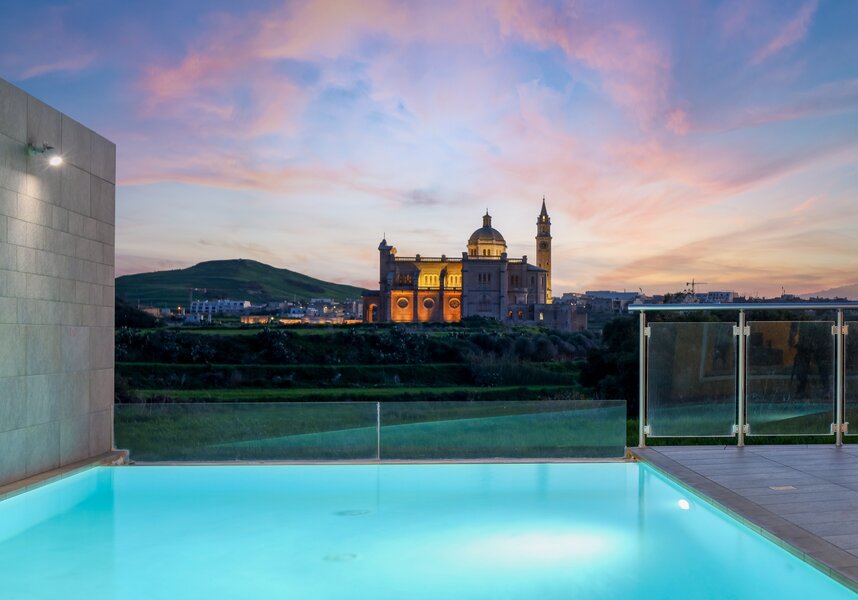 The terraced windows were a picture frame surrounding a beautiful canvas. It began with water flowing seamlessly from the pool toward an iconic view of Ta Pinu (Basilica of the National Shrine of the Blessed Virgin of Ta' Pinu). A Church of international acclaim sitting perfectly in Twilight's trajectory.