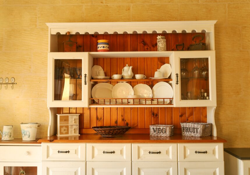 Inside, a lounge, dining and kitchen space are finished with a homely cottagie feel. A pretty country dresser sits next to a dining table and open plan kitchen. The white painted finish gives the living space a distinct Mediterranean feel.