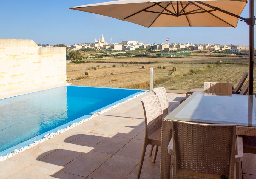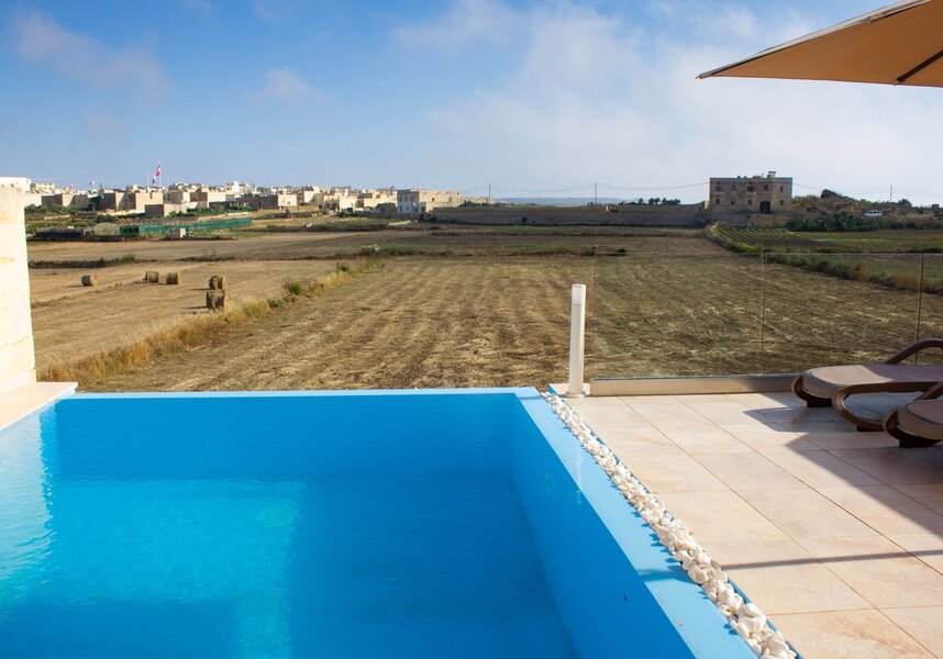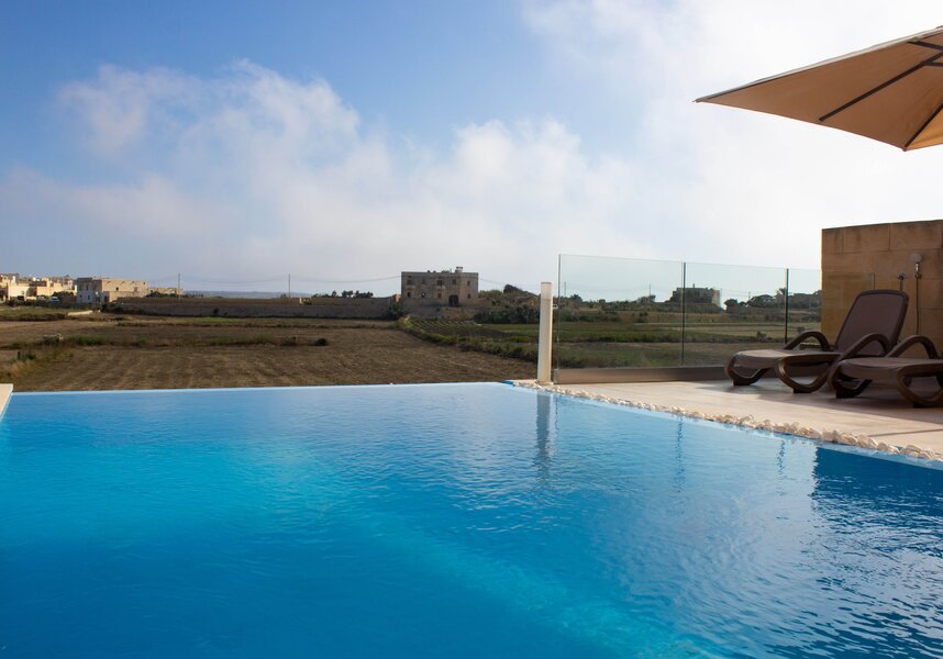 Here, the ambiance becomes real in its most explicit form. Light and stunning panoramic images of the island beyond the seamless infinity pool ignite. Stretching to St Lawrenz, the only interruption is a glass panel across the terrace. Hardly an interference!