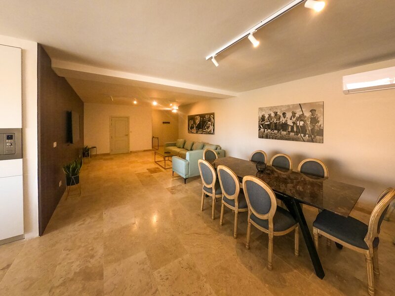 The entrance brings you into a bright living space. A 6-seater sofa is positioned in front of a large TV with satellite channels, video-on-demand and live sports streaming.